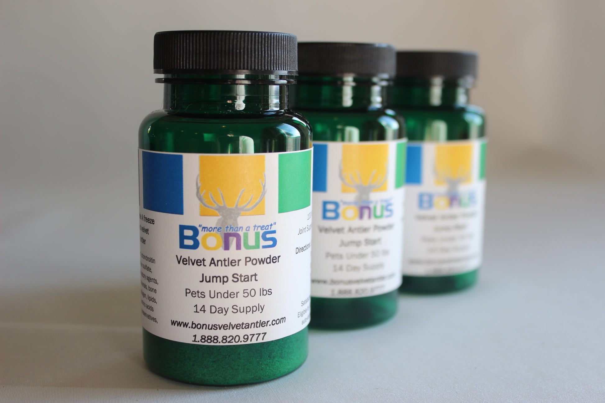 Bonus Jump Start is a short-term velvet antler powder designed to give older, injured, or depleted dogs a nutritional on-ramp, not a forever supplement.